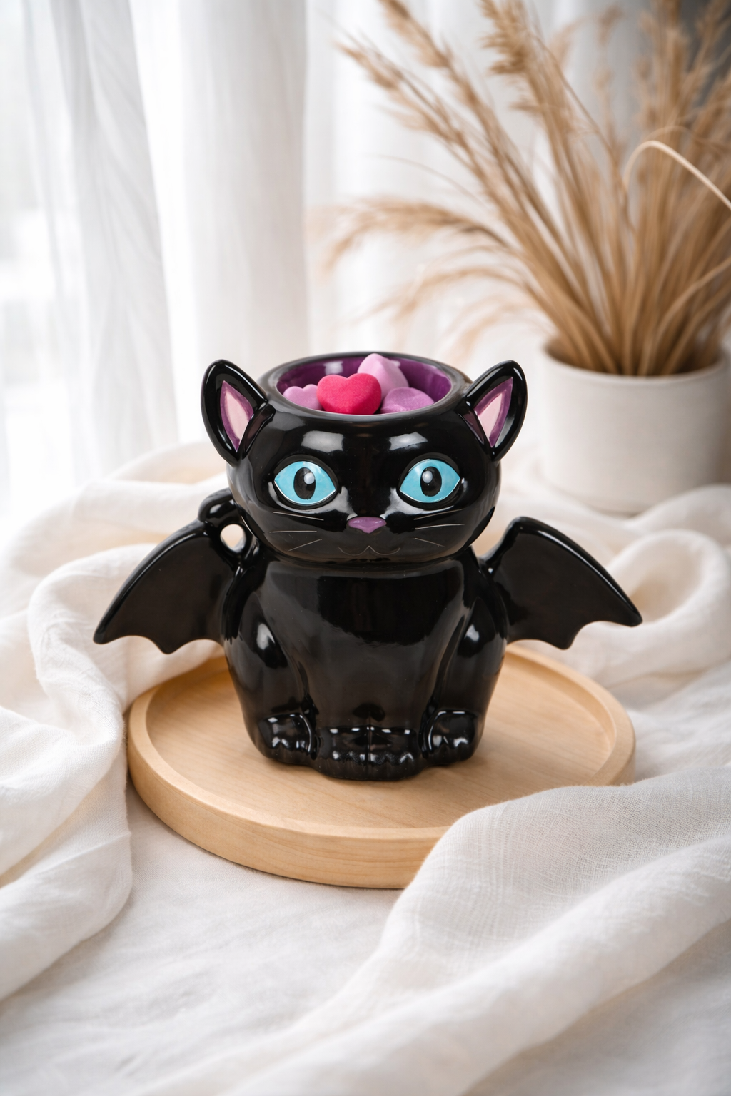 🦇🐱 Dale un toque misterioso y encantador a tu hogar con este original quemador de wax melts en forma de gato murciélago. Su diseño divertido y ligeramente oscuro combina a la perfección con decoraciones de estilo Halloween, gótico o witchy, convirtiéndolo en una pieza única y llena de personalidad.